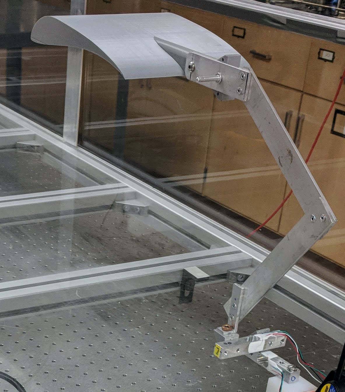 Wing segment testing apparatus in a small wind tunnel.
